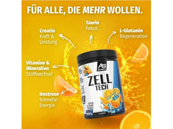 Unser ZELLTECH ist ideal zur Nutzung vor, während und direkt nach dem Training. Der fertige Drink, aus Wasser und Pulver gemischt, ist lecker fruchtig, erfrischend und liefert neben insgesamt 3000 mg Creatin und 1600mg L-Glutamin auch 1200 mg Taurin, Mineralstoffe und Vitamine.