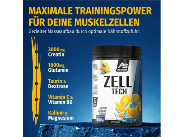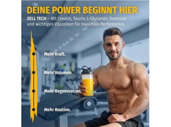 ZELLTECH enthält ein Mix aus besten und bewährten Zutaten, optimal dosiert und perfekt als Vorbereitung auf die nächste, intensive und kraftraubende Trainingseinheit.Enthält Dextrose, 3000 mg Creatin, 1600 mg L-Glutamin und 1200 mg L-Taurin je Portion + Mineralsofffe und Vitamine, darunter Vitamin C und B6.