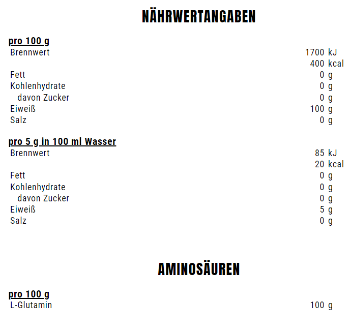 L-Glutamin zählt zu den semi-essentiellen Aminosäuren, d.h. dass die Eigensynthese des Körpers unter gewissen Umständen (z.B. intensive physische Belastung) möglicherweise nicht ausreicht, um den Bedarf zu decken. Das reine WEIDER® L-Glutamine Pulver ist nahezu geschmacksneutral und leicht löslich. Somit lässt es sich problemlos in deinen Proteinshake oder dein Lieblingsgetränk einrühren. Jede Dose WEIDER® L-Glutamine enthält 400 g Pulver, was ganzen 80 Portionen á 5 g entspricht!
